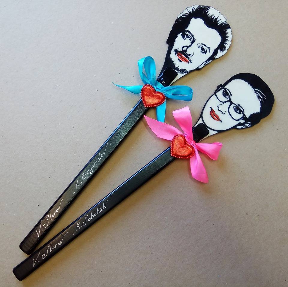 Художник Василий Слонов презентовал новый проект – мухобойки в виде Константина Богомолова и Ксении Собчак. Накануне прошла свадьба режиссера и экс-кандидата в президенты РФ.