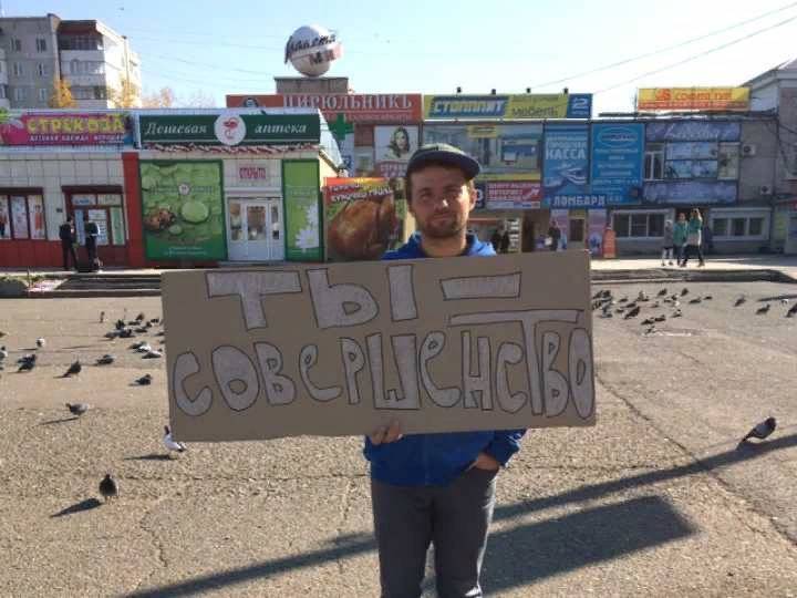 Оказалось, что мужчина с плакатом - лесосибирец Максим Чувашев. Среди местных жителей он прославился необычным заработком. Мужчина на улице раздавал «эмоциональные советы» за 50 рублей. На большие деньги «уличный психолог» не рассчитывал. Его цель была - дать людям высказаться.
