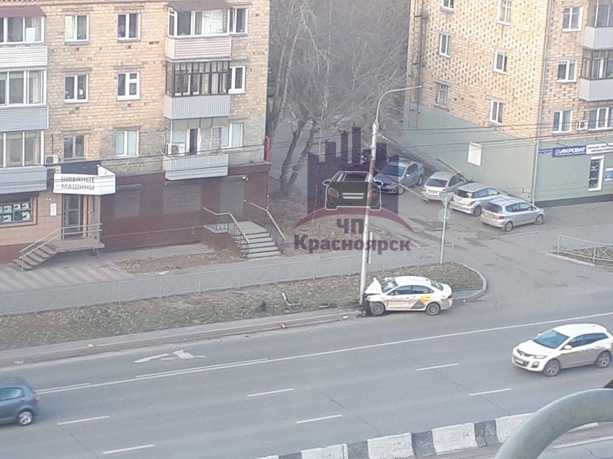 В Красноярске на улице Партизана Железняка таксист на полном ходу врезался в фонарный столб. Видео ДТП с камер уличного наблюдения попало в соцсети.
