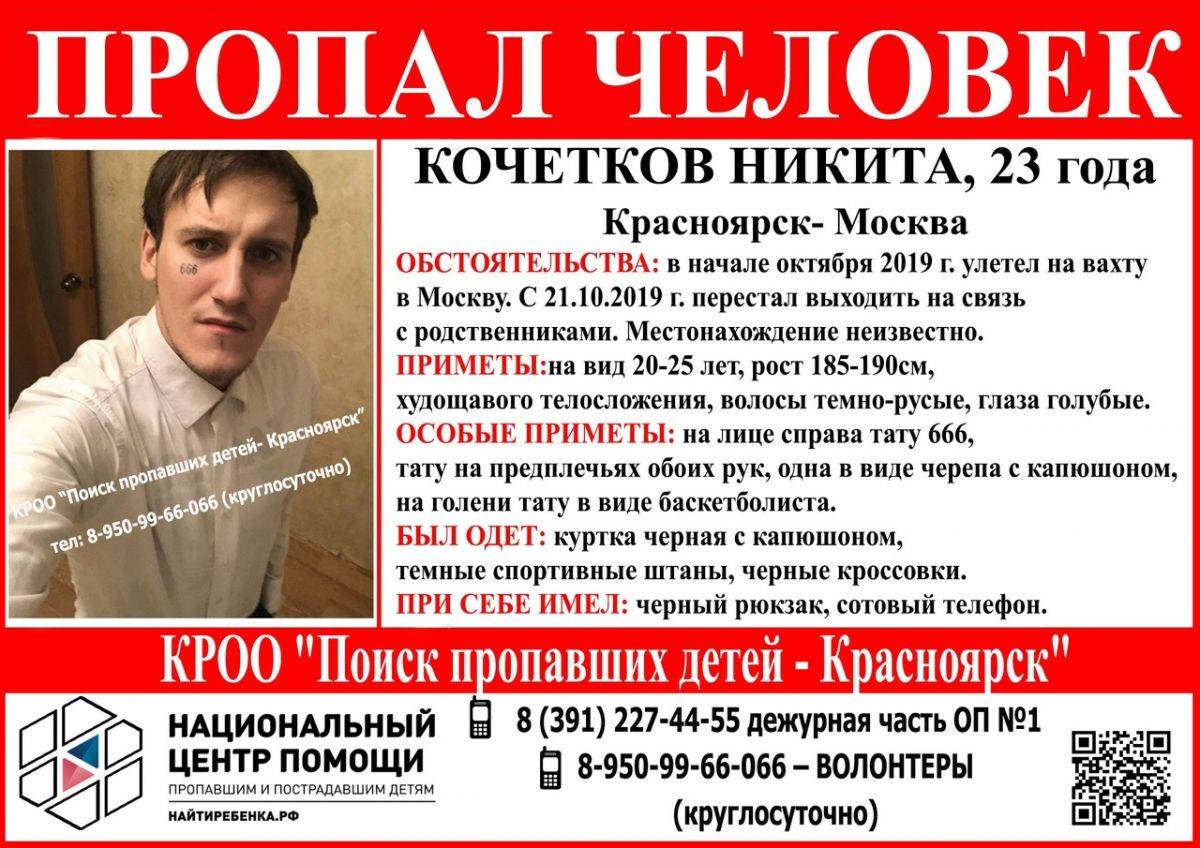 Как сообщается ориентировке волонтёрской организации «Поиск пропавших детей — Красноярск»,, 23-летний Никита Кочетков пропал почти два месяца назад. 10 октября мужчина перестал выходить на связь с родственниками. В тот момент он находился в Москве. До сих пор о его местонахождении ничего неизвестно.