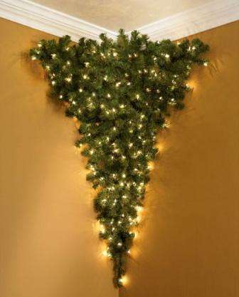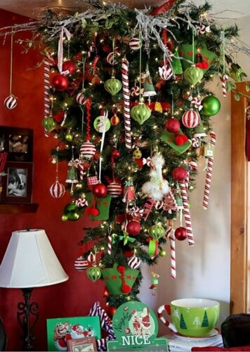 Если хочется чего-то необычного, можно установить ёлку на потолке. Такой вариант подойдет для офисов, загородных домов или, например, если у вас слишком активный домашний питомец. Такую ёлку он точно не перевернет. Главное, надежно укрепить ее на потолке.