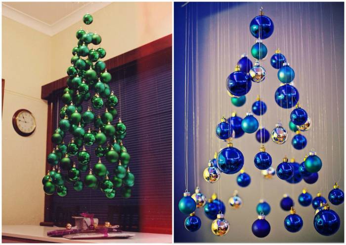 Ваших друзей и соседей удивит оригинальная ёлка, парящая в воздухе. Чтобы ее сделать вам понадобится решетка, леска и новогодние шары.