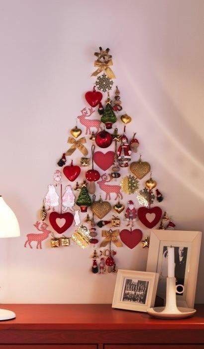 Этот вариант очень бюджетный и экономит место в доме. Елочку на стене можно сделать из чего угодно: веточек, веревок, новогодних шаров, фотографий, мишуры, шишек. А если еще и украсить гирляндой, то получается очень празднично.