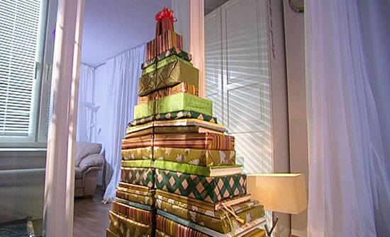 #6 Ёлка с сюрпризом Вместо традиционной ели, можно выложить новогоднее дерево из настоящих подарков. В качестве украшения можно использовать гирлянду.