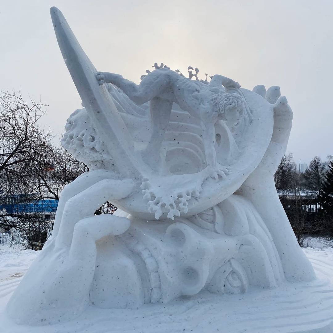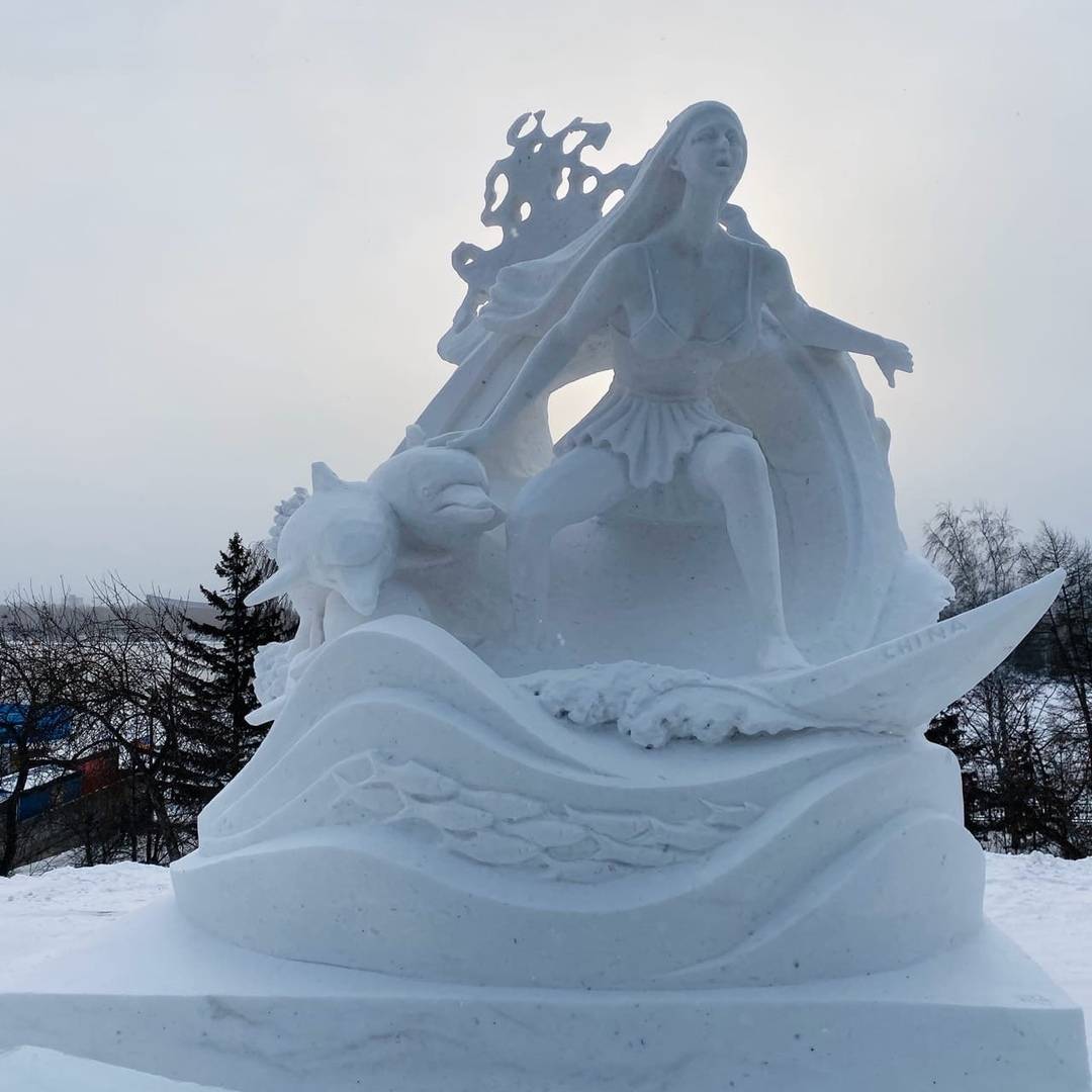Победа досталась работе «Серфинг» от команды «HIT 1» из китайского города Харбин. В снежной композиции застыл динамичный момент скольжения героини по волнам.