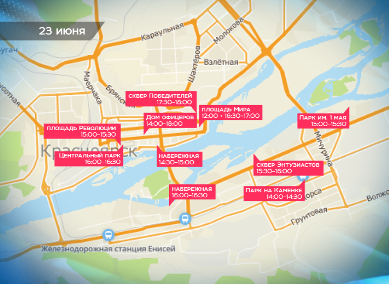 с 15.30 до 16.00 — сквер Энтузиастов (пр. им. газеты «Красноярский рабочий», 120Б);