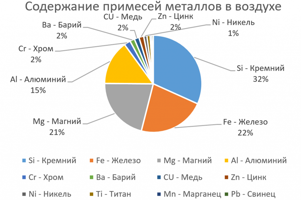 В воздухе также нашли 21% магний – этот показатель говорит о действии выбросов от автотранспорта. Следом 15% идет оксид алюминия. Концентрация хрома, бария, меди и никеля в воздухе составляет 1-2% каждый.