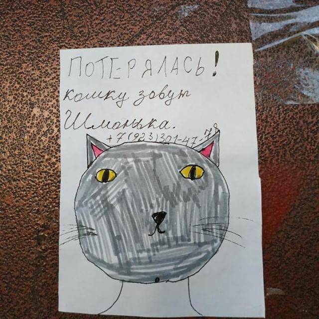 Жители Солнечного опубликовали фотографию забавной листовки на двери одного из подъездов. Кто-то написал объявление о потерявшейся кошке по кличке Шмонька, и оставил номер телефона. «Портрет» кошки был не очень реалистично нарисован от руки.