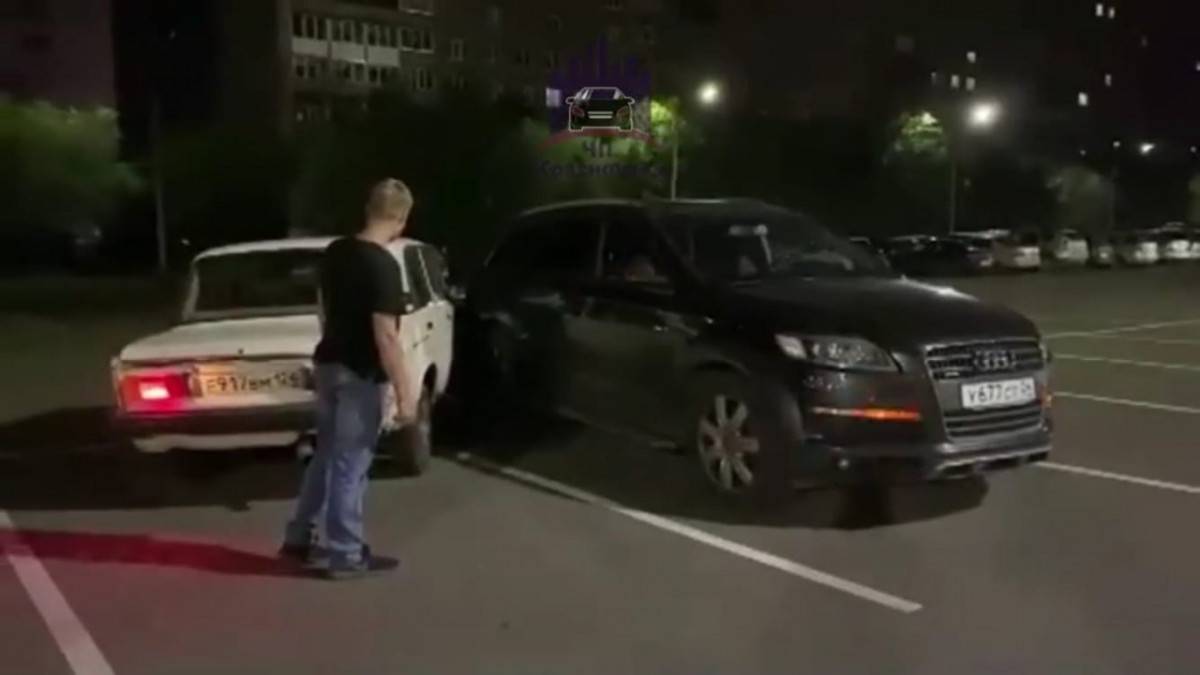 Все произошло на парковке ТЦ «Красноярье». Видео с места ДТП появилось в социальных сетях. На кадрах видно, как водитель «Жигулей» резко разворачивается и врезается в «Ауди». Удар пришелся на заднюю часть авто. После этого парень вышел из машины и только развел руками.