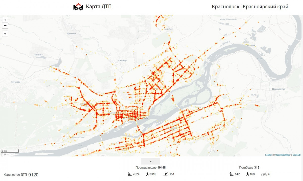 Карта показывает данные с базы ГИБДД. Согласно ей, за 5 лет в Красноярске произошло почти 9,5 тыс. аварий. Чаще всего в ДТП попадают автомобилисты — больше 6 тыс. пострадавших и 127 погибших. На втором месте пешеходы — почти 3 тыс. пострадавших и 150 погибших. И реже всего в аварии попадают велосипедисты — всего 134 пострадавших и 4 погибших за 5 лет.