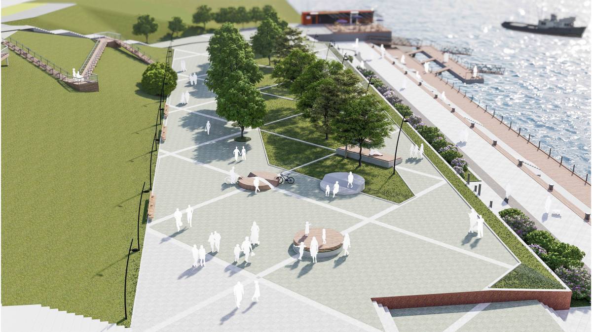 На набережной появится зона променада и ожидания речного транспорта, спуски к воде, качели, кафе, амфитеатр и необычная уличная мебель. Одну из беседок обещают сделать в виде арт-объекта.
