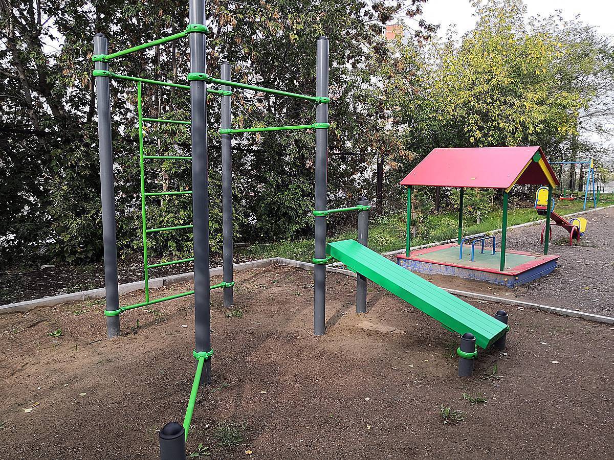 Спортивная площадка появилась прямо во дворе жилого дома на ул. Менжинского 8а. Там смогут заниматься как дети, так и пожилые люди. В городке установили оборудование для занятий воркаутом, скамью для пресса, турники, шведскую стенку и устройство для отжиманий. Для обустройства площадки использовали песчано-щебеночную смесь.