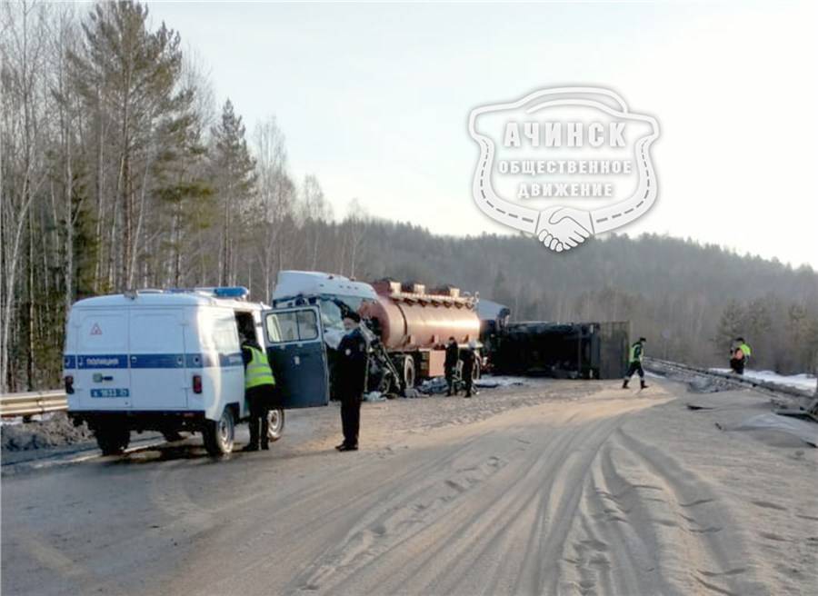 Первая авария случилась, примерно, в 80 км от Ачинска. Водитель легкового автомобиля Mercedes выехал на полосу встречного движения, где врезался в бензовоз MAN. В результате водитель грузового автомобиля погиб. Трасса полностью перекрыта.