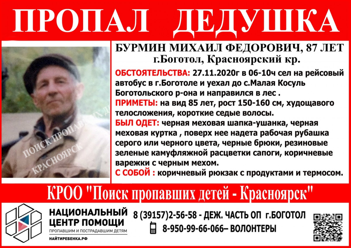 Всех, кому известно местонахождение пропавшего, просят сообщить по телефонам: 8 (391) 572-56-58 — полиция и 8-950-996-60-66 — волонтеры.