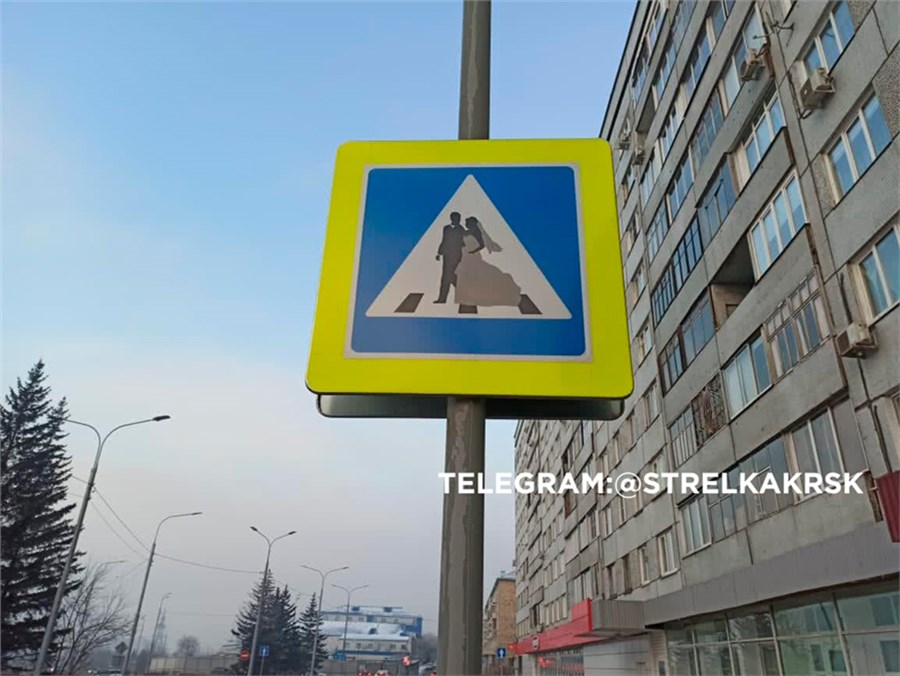 Возле Дворца бракосочетаний на улице Дубровинского в Красноярске неизвестные наклеили на дорожный знак «Пешеходный переход» изображение молодожёнов. Его фотографии опубликовал телеграм-канал «Стрелка».