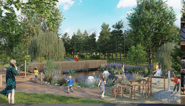 Также в сквере появится искусственный водоём с фонтанами, а вокруг него оборудуют детскую игровую зону с водокачкой и деревянными желобами для игр с водой. Всё детское оборудование будет максимально интегрировано в природную среду.