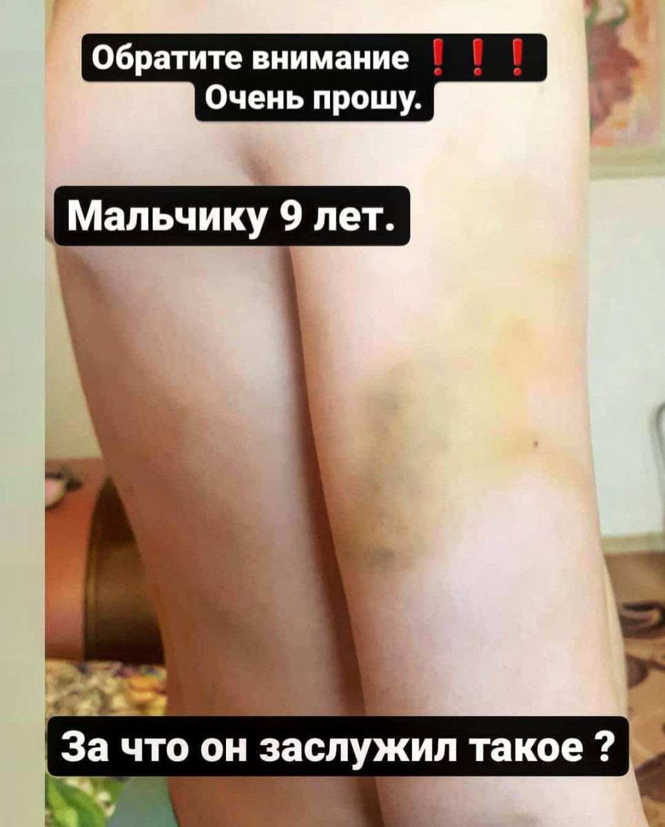 В Канске родственники госпитализированного на днях 9-летнего мальчика сообщили о том, что ребёнка систематически избивают его отец и мачеха. Об этом двоюродная сестра подростка рассказала в своём «Инстаграме», опубликовав в доказательство фотографии и видео с зафиксированными синяками на теле и голове школьника. Девушка просит максимального распространения данной информации, чтобы помощь своему несовершеннолетнему брату.