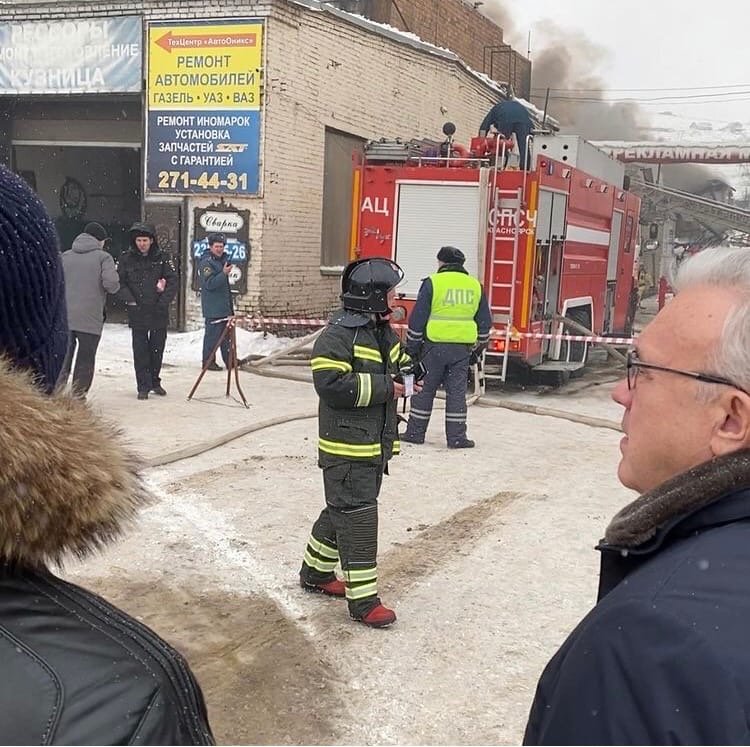 Горит склад частной̆ компании «Автотрейд». Глава региона Александр Усс приехал на место, говорит — ситуация тяжёлая. Пожарные ему доложили — предельное время работы изолирующих противогазов у пропавшей группы пожарных, 40 минут — вышло.