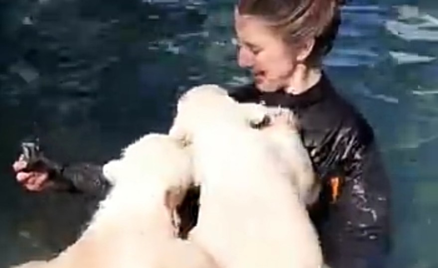 С первых секунд медвежата уверенно погребли лапами, но к самостоятельным заплывам они еще не готовы и старались как можно быстрее оказаться у мамы на руках. Сотрудница зоопарка следила, чтобы носики детенышей оставались над водой.