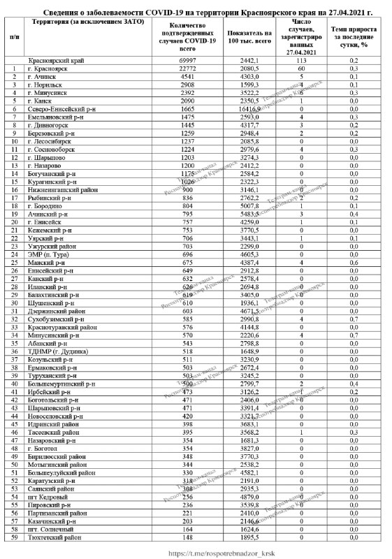 По сообщению регионального Роспотребнадзора, в Красноярском крае 113 новых случаев заражения коронавирусом за прошедшие сутки. Выздоровели в крае 98 человек. За все время в Красноярском крае 69 997 подтвержденных диагнозов, всего выздоровели 64 529 человек. Темп прироста за сутки — 0,2%. За все время в крае проведено 2 610 702 тестов на коронавирус, в том числе 537 за последние сутки. Сейчас под наблюдением врачей находятся 16 353 человека.
