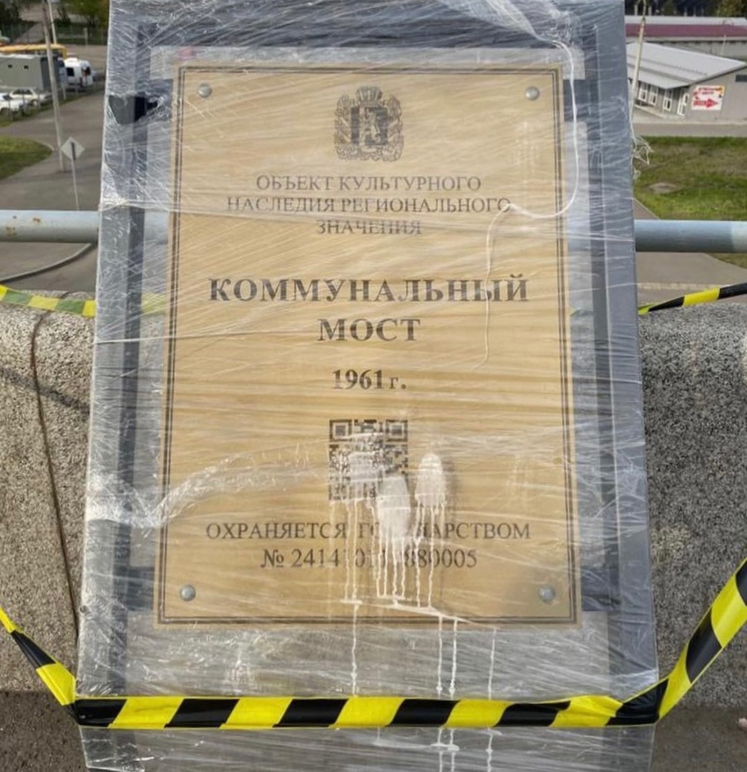 На табличке указано, что Коммунальный мост относится к объектам культурного наследия регионального значения. На табличке также присутствует штрих-код. С его помощью можно узнать историю объекта.