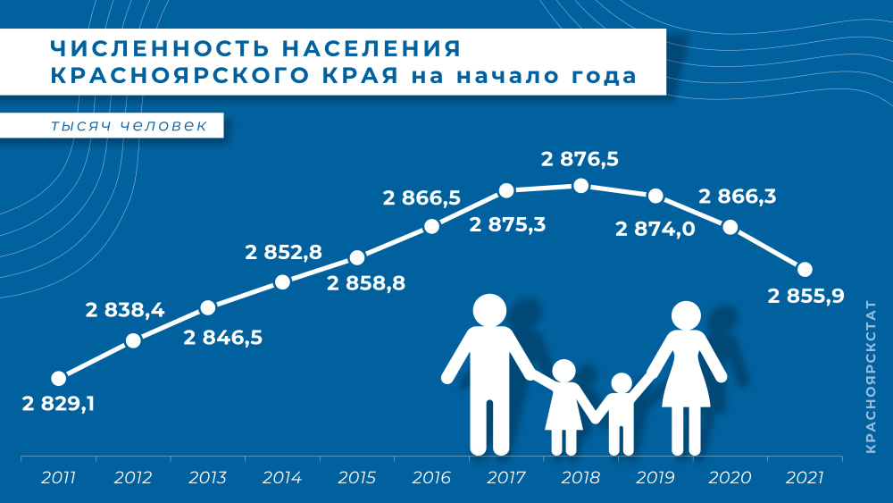 Статистики обнародовали данные о численности населения Красноярского края на начало текущего года. В нашем регионе проживает меньше 3-х миллионов человек, а именно — 2 855 899. При этом в Красноярскстате отмечают сокращение числа жителей в крае. Такая тенденция наблюдается примерно после 2018 года. Например, за последний год население региона уменьшилось более чем на 10 тысяч человек.