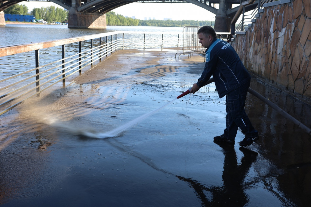 Не дожидаясь пока воды Енисея полностью освободят набережные Красноярска, специалисты Красгорпарка уже начали наводить порядок.