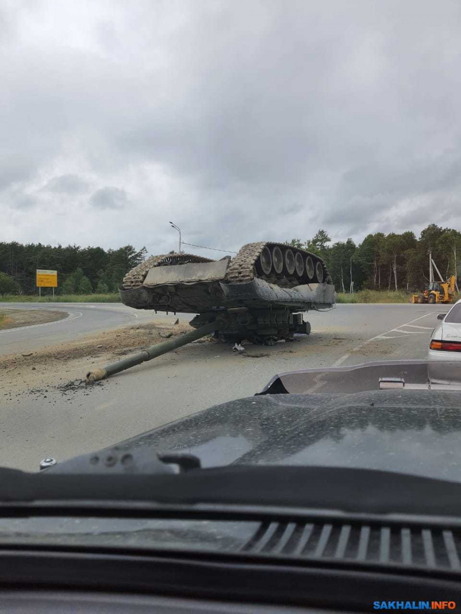 Накануне днём тяжёлую военную технику перевозили на автомобильных платформах со стороны посёлка Анива, - сообщает Сахалин-инфо. При повороте на улицу Фархутдинова танк упал с платформы, и перевернулся на башню.