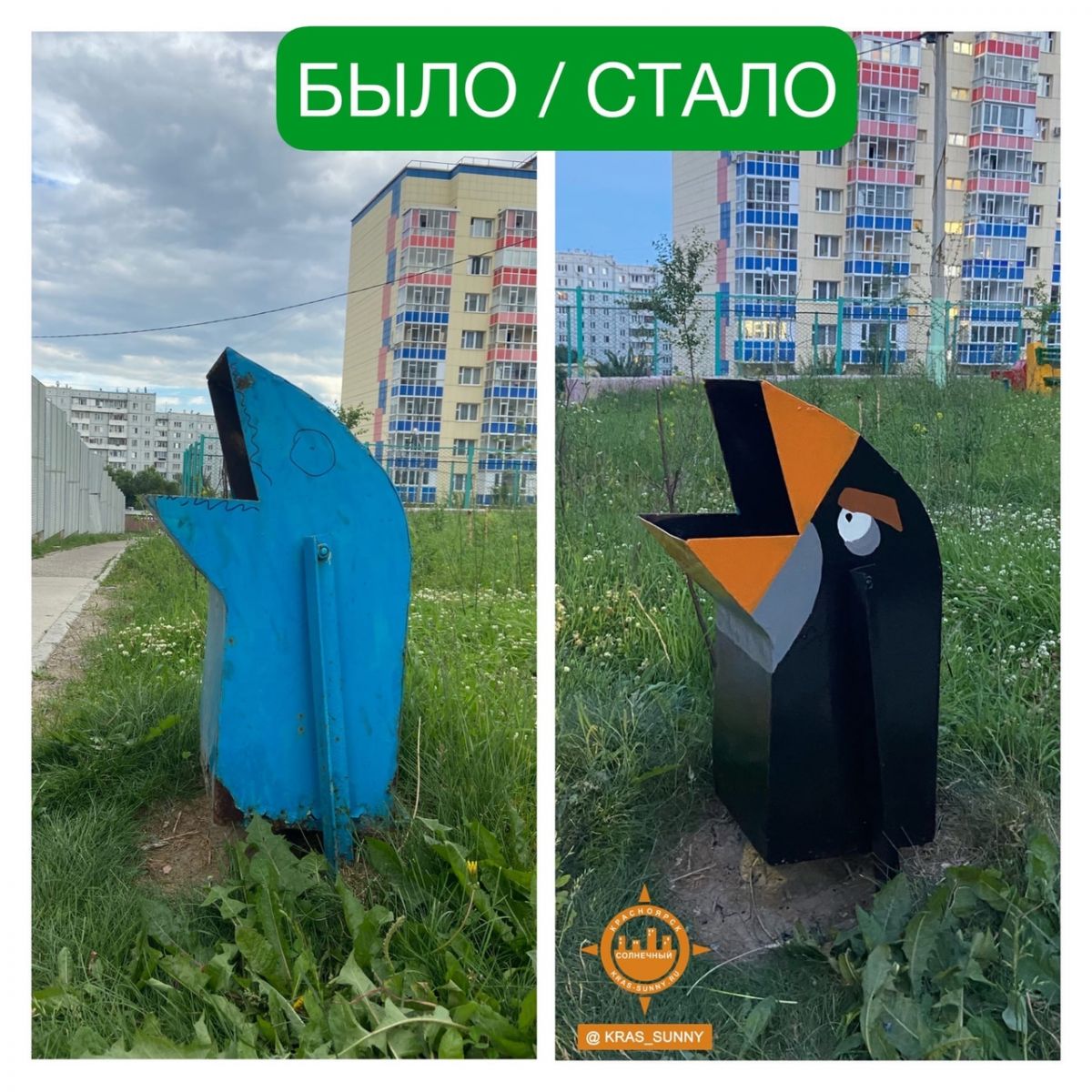 Жители Солнечного раскрасили старые урны возле дома номер 34 на улице 60 лет образования СССР. Они зачистили старую краску, очистили урны от ржавчины и раскрасили в виде персонажей из игры Angry Birds. Результатом поделился автор проекта Максим в своём паблике «Наш мкр. Солнечный. Красноярск» в Instagram и ВКонтакте.