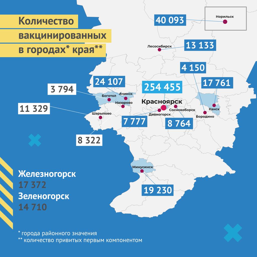 Центр управления регионом (ЦУР) Красноярского края совместно с Минздравом и центром СПИД составили карту вакцинации от COVID-19. Теперь у жителей региона есть возможность наглядно оценить темпы вакцинации по городам и районам. Карта будет обновляться еженедельно в официальных группах ЦУР во ВКонтакте и Инстаграме, чтобы можно было отслеживать динамику прививочной кампании.