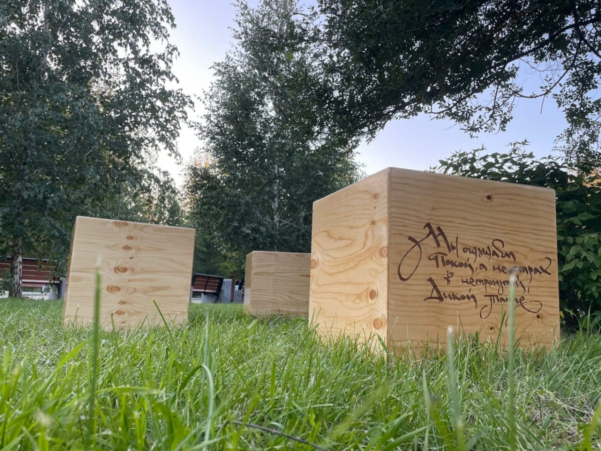 Он состоит из 10 деревянных кубов с цитатами о Сибири и сибиряках. Надписи выполнены в технике эмоциональной каллиграфии с использованием русской скорописи. Кубы сделаны из хвойной фанеры и покрыты яхтовым лаком. Это позволяет уличной мебели быть устойчивой к перепадам погоды.