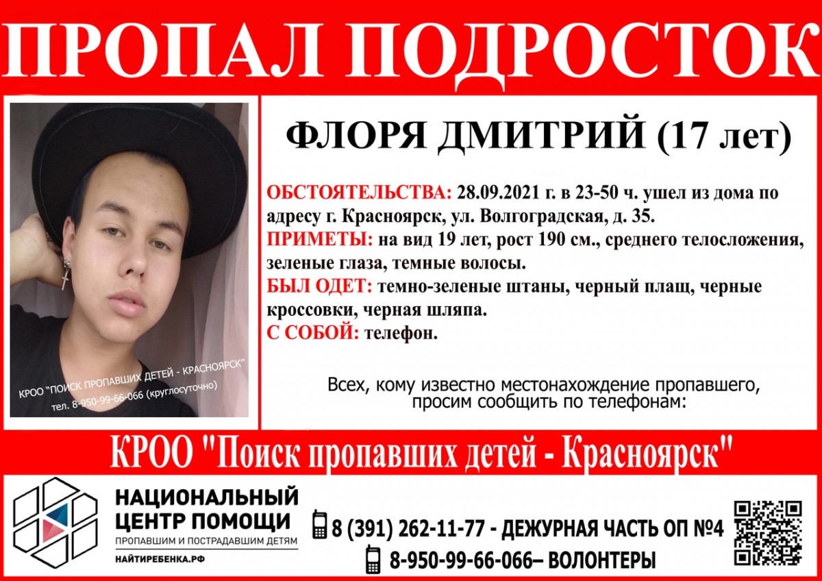 Всем, кому что-либо известно о местонахождении пропавшего юноши или обстоятельствах его исчезновения, сообщить по телефонам: 8 (391) 227-06-45, 8 (391) 213-78-06 или 02.