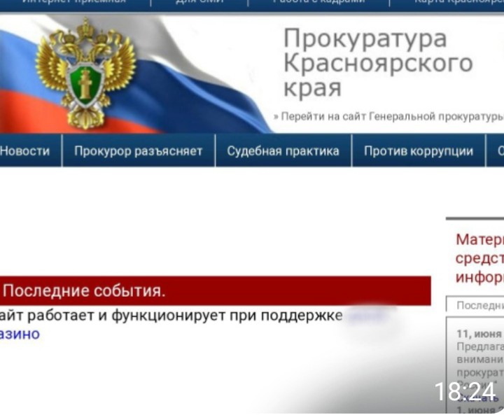 Сайт прокуратуры Красноярского края, который был неактивным с прошлого года, взломали неизвестные. Сейчас ресурс открывается, и на нем в рубрике «Последние события» появилась надпись: «Сайт работает и функционирует при поддержке онлайн-казино». Об этом первым сообщил телеграм-канал «Планерка Красноярск». Все остальные разделы сайта не открываются.