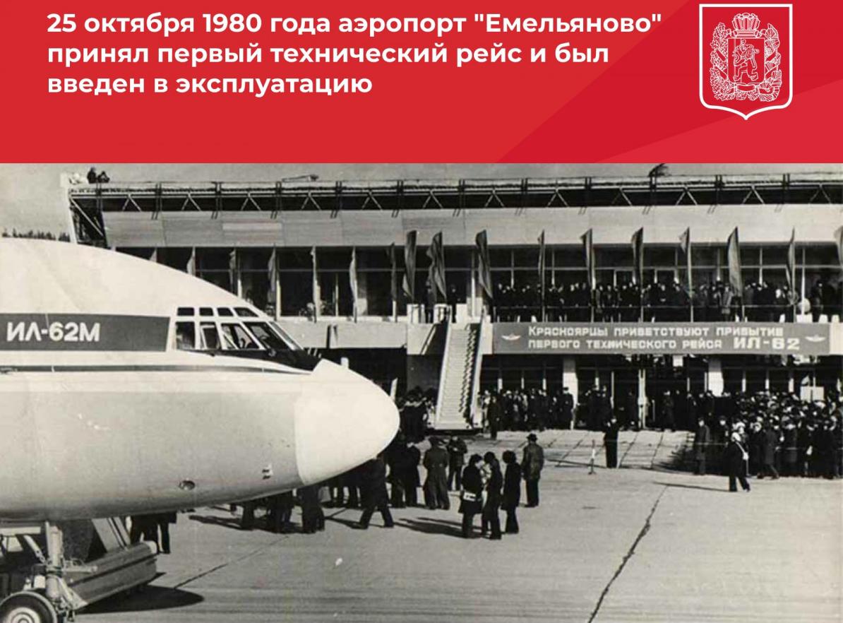 Ровно 41 год назад, 25 октября 1980-года, был введён в эксплуатацию аэропорт Красноярска, построенный в Емельяновском районе. В этот же день состоялся первый технический рейс Ил-62 из Москвы. Объект строили, начиная с 1970 года.