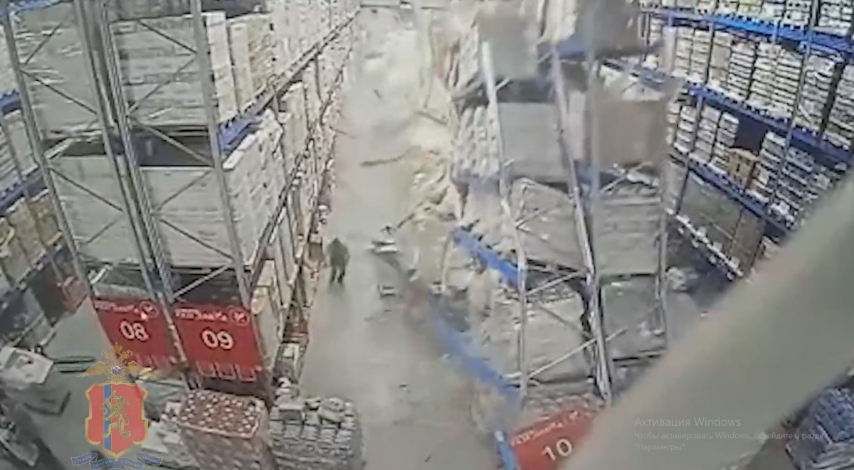 А в МВД по Красноярскому краю опубликовали видео с камеры наблюдения на складе, которая зафиксировала момент обрушения стеллажей. На записи видно, что сначала падает один ряд конструкций. Рядом идущий грузчик пытается спрятаться под другим рядом стеллажей, но следом рухнул и он.