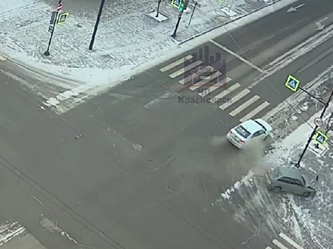 В центре Красноярске на перекрестке проспекта Мира и улицы Робеспьера произошло ДТП: столкнулись ВАЗ и автомобиль такси. Авария попала на камеры видеонаблюдения. Судя по кадрам, таксист совершал левый поворот, и не уступил дорогу ВАЗу, который ехал на довольно большой скорости.