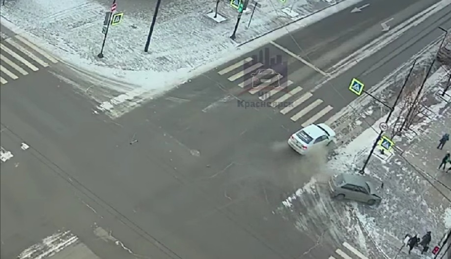 В центре Красноярске на перекрестке проспекта Мира и улицы Робеспьера произошло ДТП: столкнулись ВАЗ и автомобиль такси. Авария попала на камеры видеонаблюдения. Судя по кадрам, таксист совершал левый поворот, и не уступил дорогу ВАЗу, который ехал на довольно большой скорости.