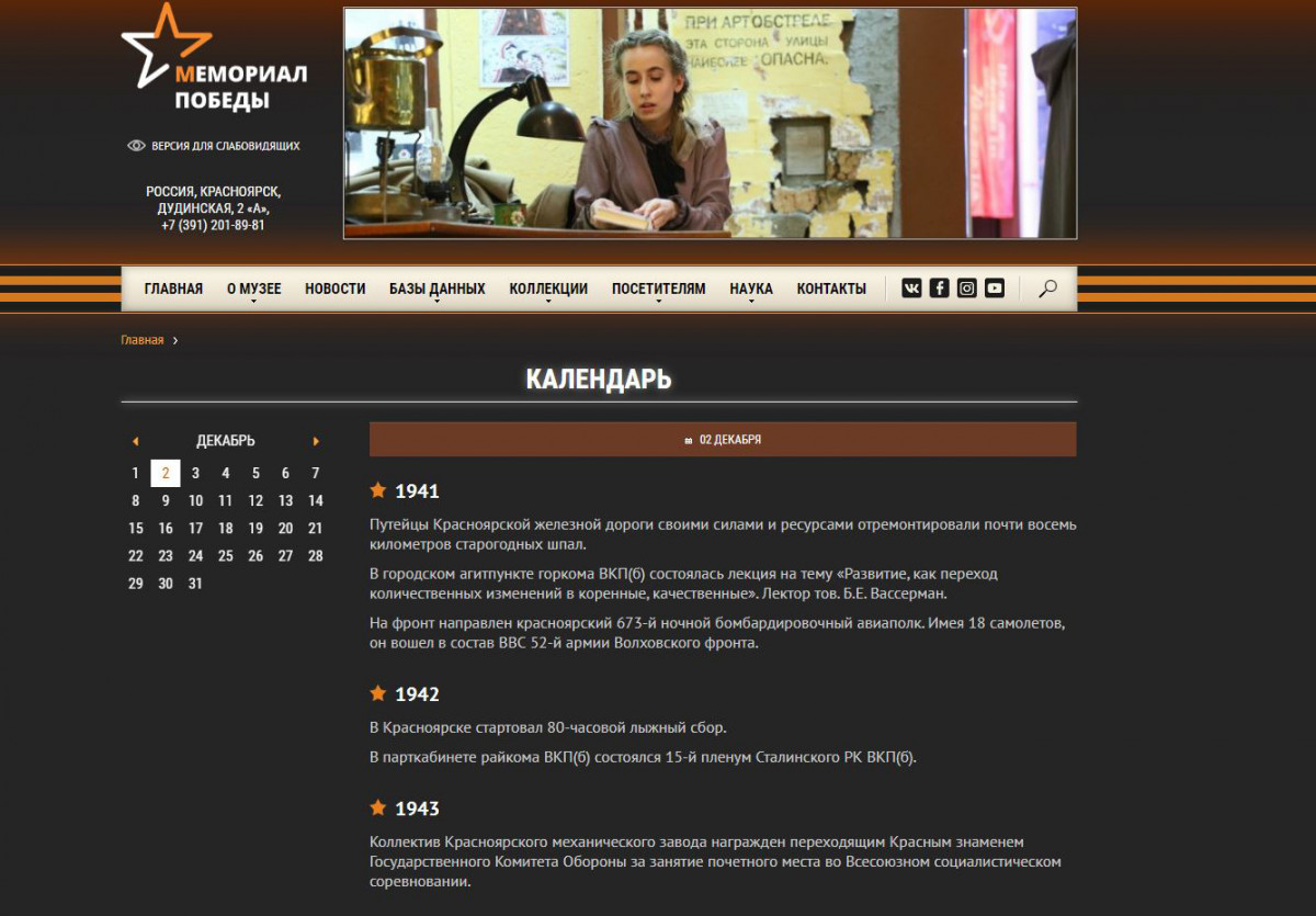 В Общественной палате Российской Федерации подвели итоги Всероссийского конкурса образовательных, туристических и культурных проектов городов, носящих почётное звание «Город трудовой доблести». Одним из победителей стал музей «Мемориал Победы», презентовавший электронную версию календаря «Красноярск. Во имя Победы. 1941-1945».