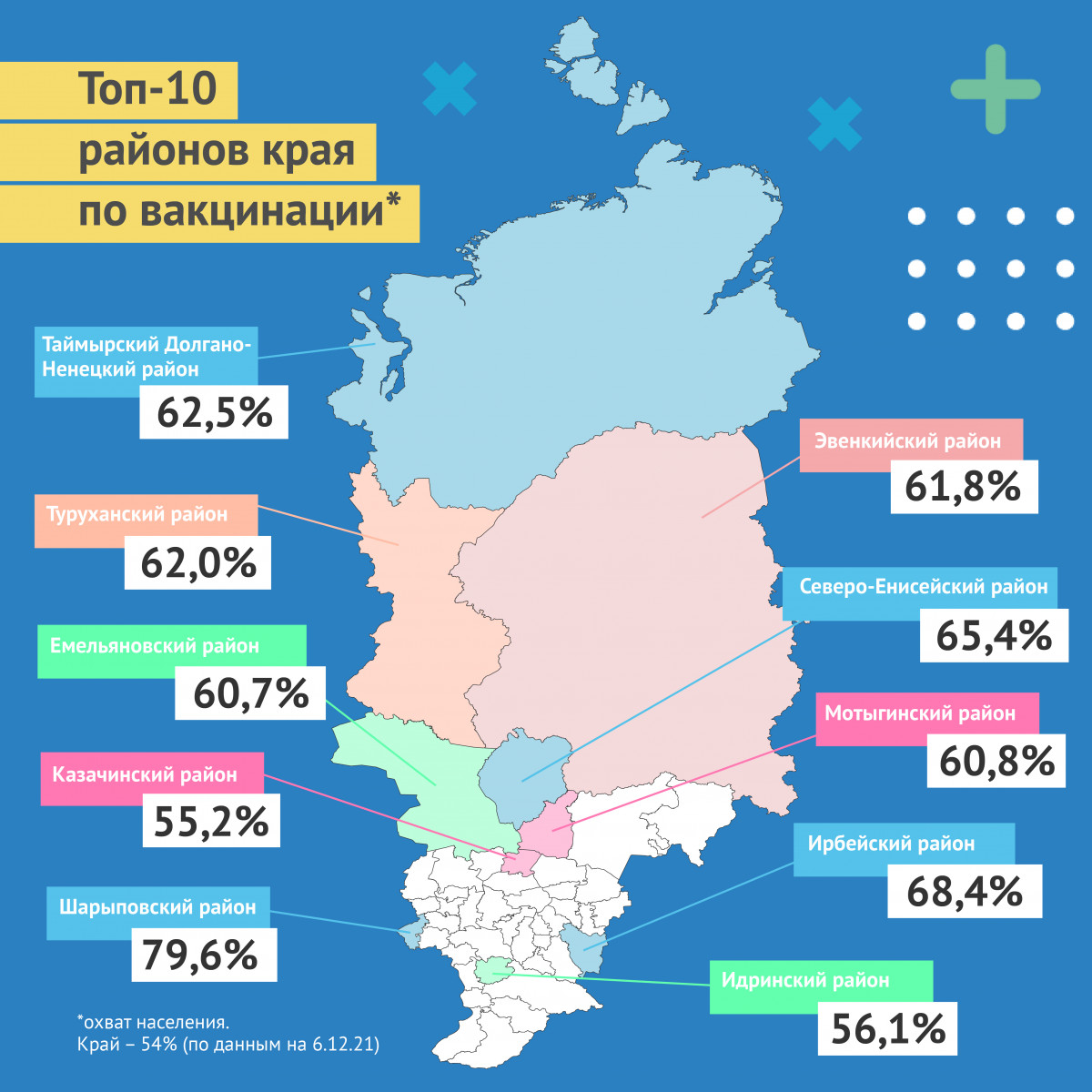 Среди городов по темпам вакцинации лидируют Дивногорск и Красноярск — 59% привитых. В краевой столице за неделю впервые вакцинировались 14 тыс человек.