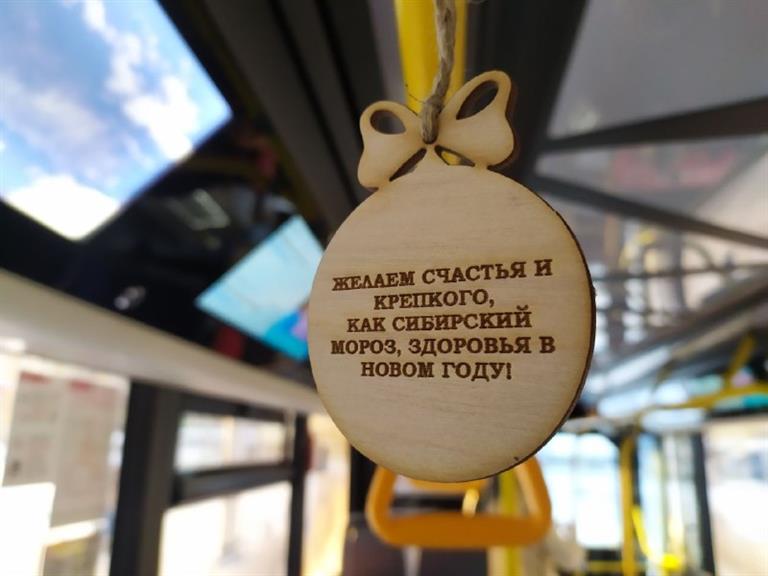 В Красноярске волонтеры украсили общественный транспорт деревянными игрушками с поздравлениями. На каждом шарике – доброе пожелание пассажирам. Такие «открытки» уже появились в троллейбусах маршрутов № 4, 6, 7, 13.