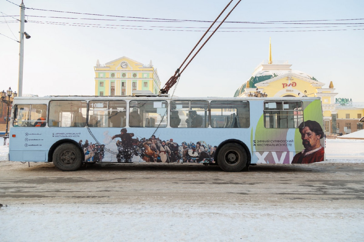 Брендированный транспорт появился в городе в честь XVI Зимнего Суриковского фестиваля.Одним из первых пассажиров «суриковского» троллейбуса № 7 стал красноярский художник Александр Суриков.
