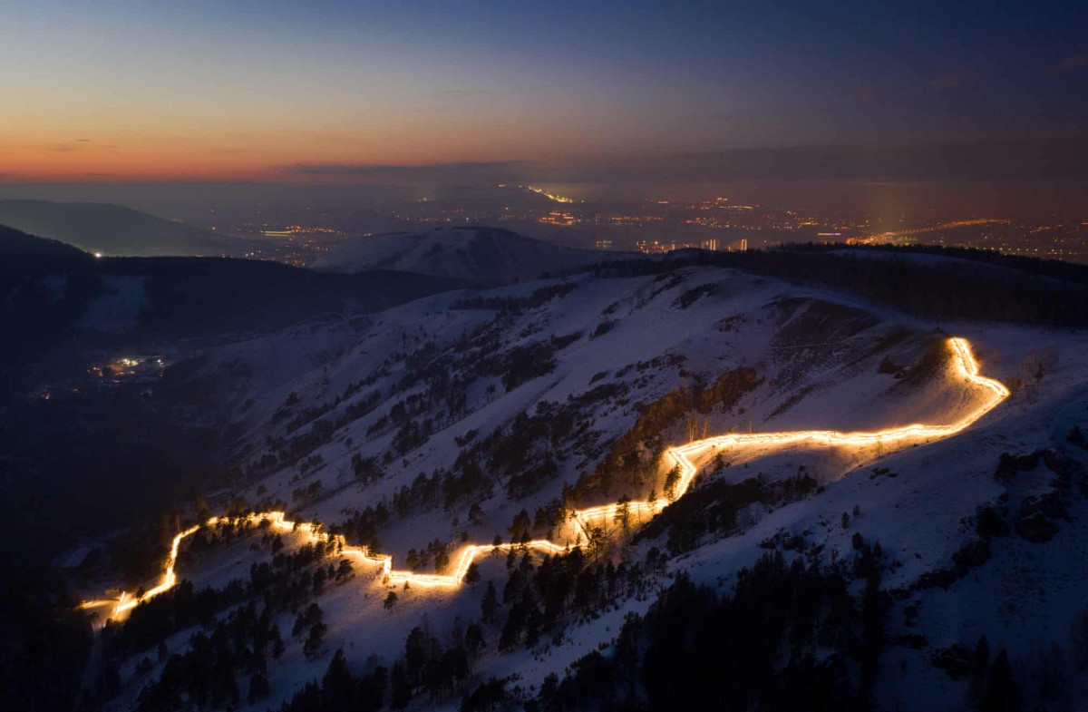 Самая длинная в стране лестница длиной 1200 метров с 1683 ступенями освещена на Торгашинском хребте под Красноярском в центральной Сибири.