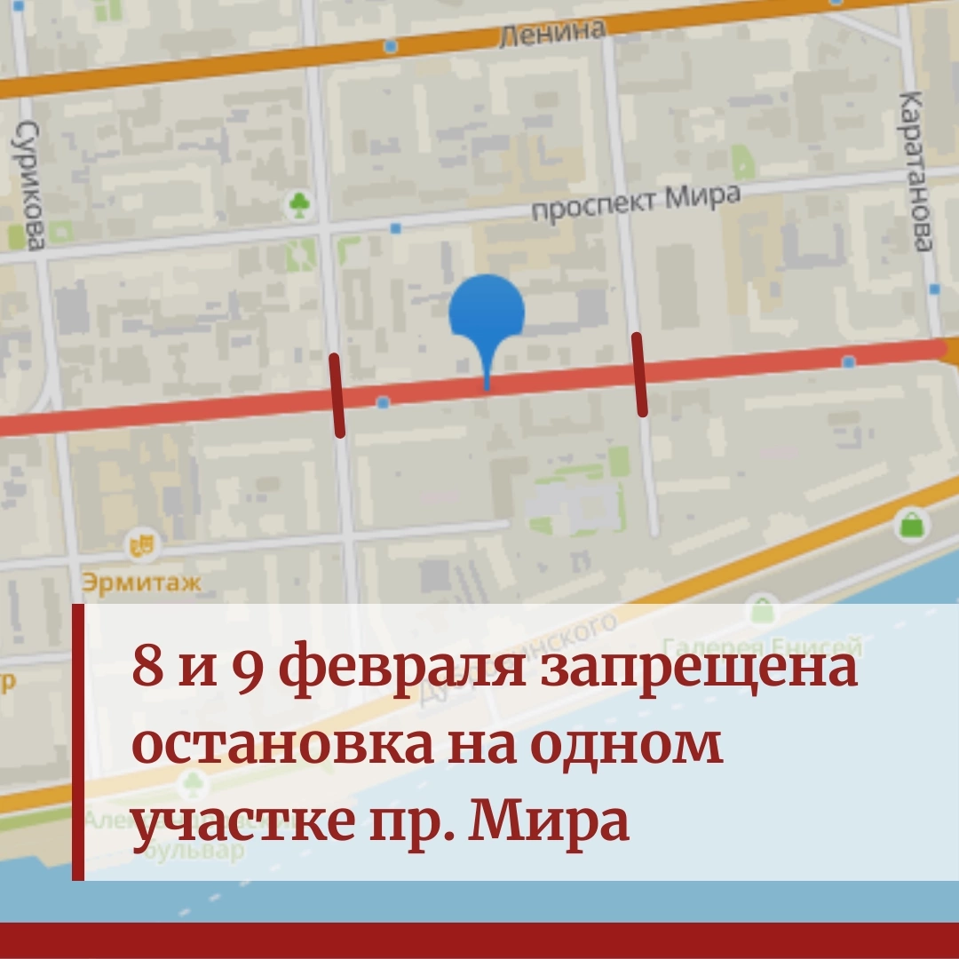8 и 9 февраля в Красноярске запретят парковать и оставлять авто на по. Мира. Речь идет об участке от ул. 9 января до Парижской Коммуны. Там будут ремонтировать дорогу.