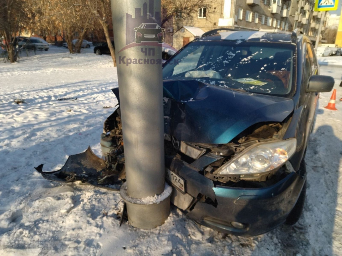 В Красноярске на улице Чайковского, водитель «Мазды», пытаясь уйти от столкновения с машиной такси, чуть не сбил пешехода и врезался в столб. Видео ДТП попала на камеры уличного видеонаблюдения.
