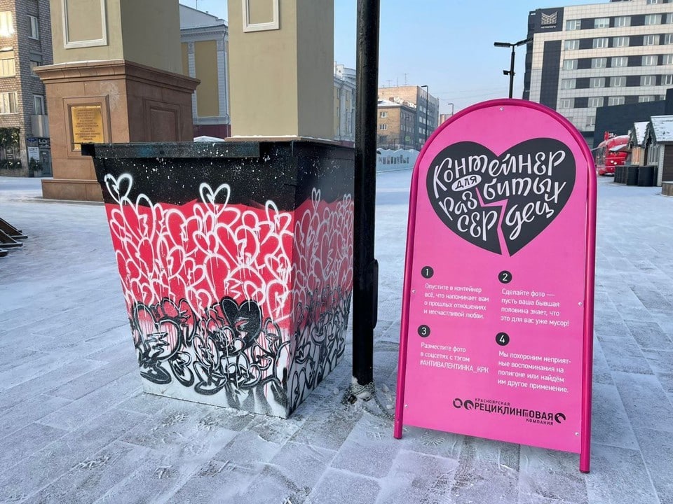 К Дню всех влюбленных в Красноярске установили мусорный бак для разбитых сердец. Об этом сообщает тг-канал «Сибирьмедиа». Он появился на площади у БКЗ.