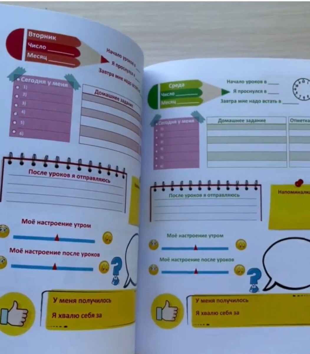 «Добрый дневник» ведется параллельно с обычным, но рассчитан на одну четверть. Главное отличие от традиционного варианта заключается в том, что в специальных разделах школьники учатся планировать день и отмечать перемены в настроении. Вот несколько примеров компонентов дневника второклассника: