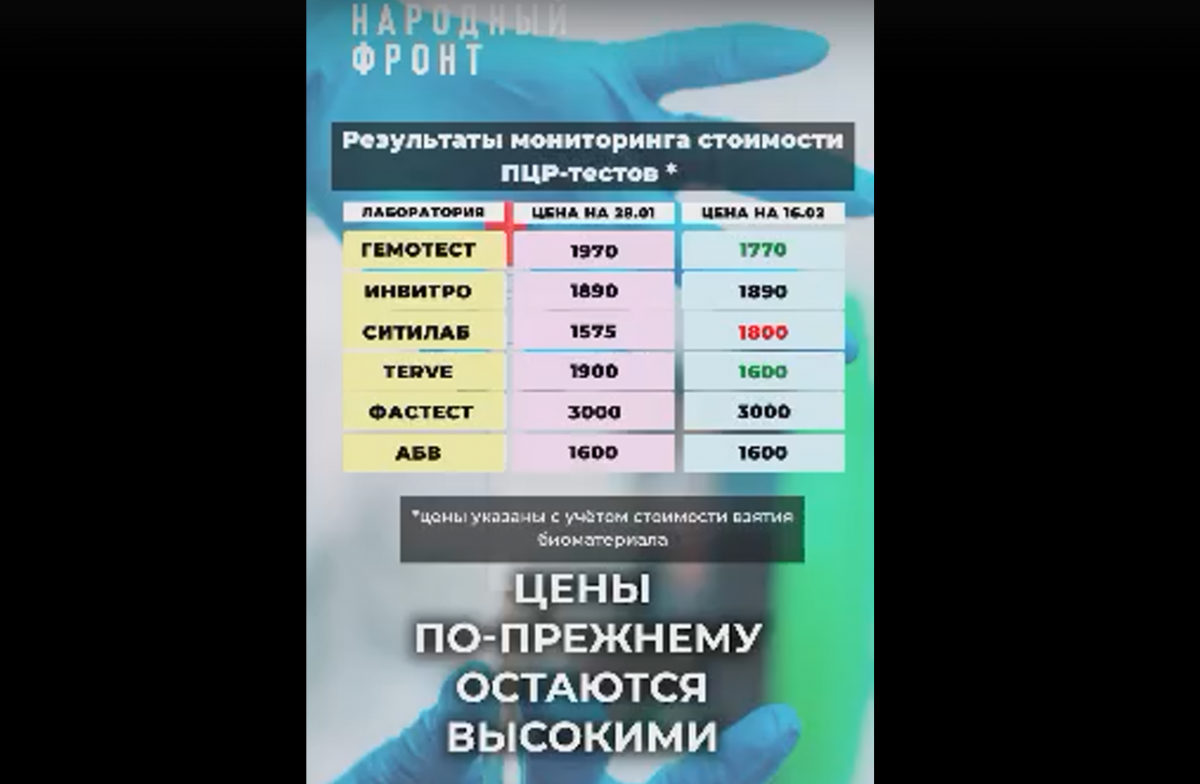 Первую проверку цен на ПЦР-тестирование представители ОНФ провели 2 недели назад, выявив завышение цен у частников. Повторная (на днях) показала, что некоторые коммерческие лаборатории снизили стоимость услуги на 200-300 рублей, но даже с учётом этого цена остаётся высокой. А в одной из лабораторий услуга напротив подорожала — на 225 рублей.