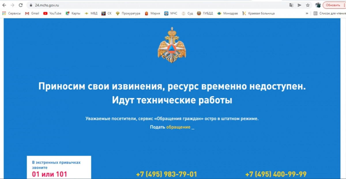 Сайт МЧС России по Красноярскому краю сегодня оказался недоступен. Заходя на главную страницу — попадаешь на объявление о том, что на ресурсе ведутся технические работы. Не открывается сервис не только у нас в регионе, но и по всей России.
