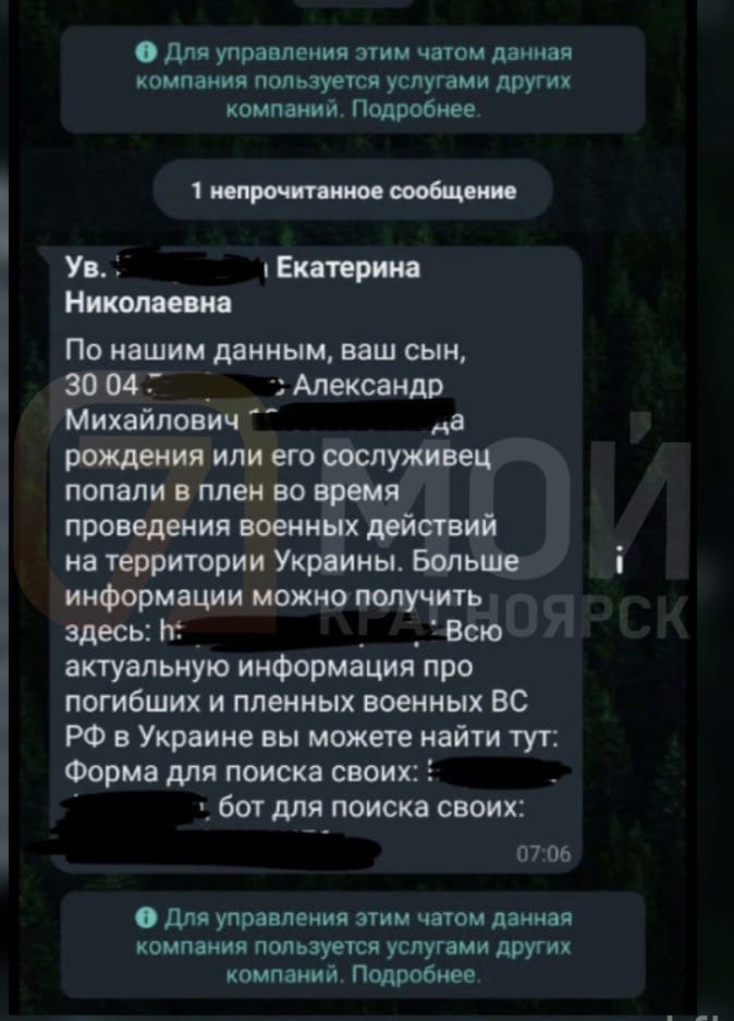 Красноярке пришло фейковое сообщение о якобы плененном в Украине сыне. Скрин этого послания он и прислал в редакцию. В сообщении говорится, что «ваш сын или его сослуживец попали в плен во время проведения специальной военной операции». Далее идет ссылка на ресурс, где якобы можно узнать более подробную информацию.