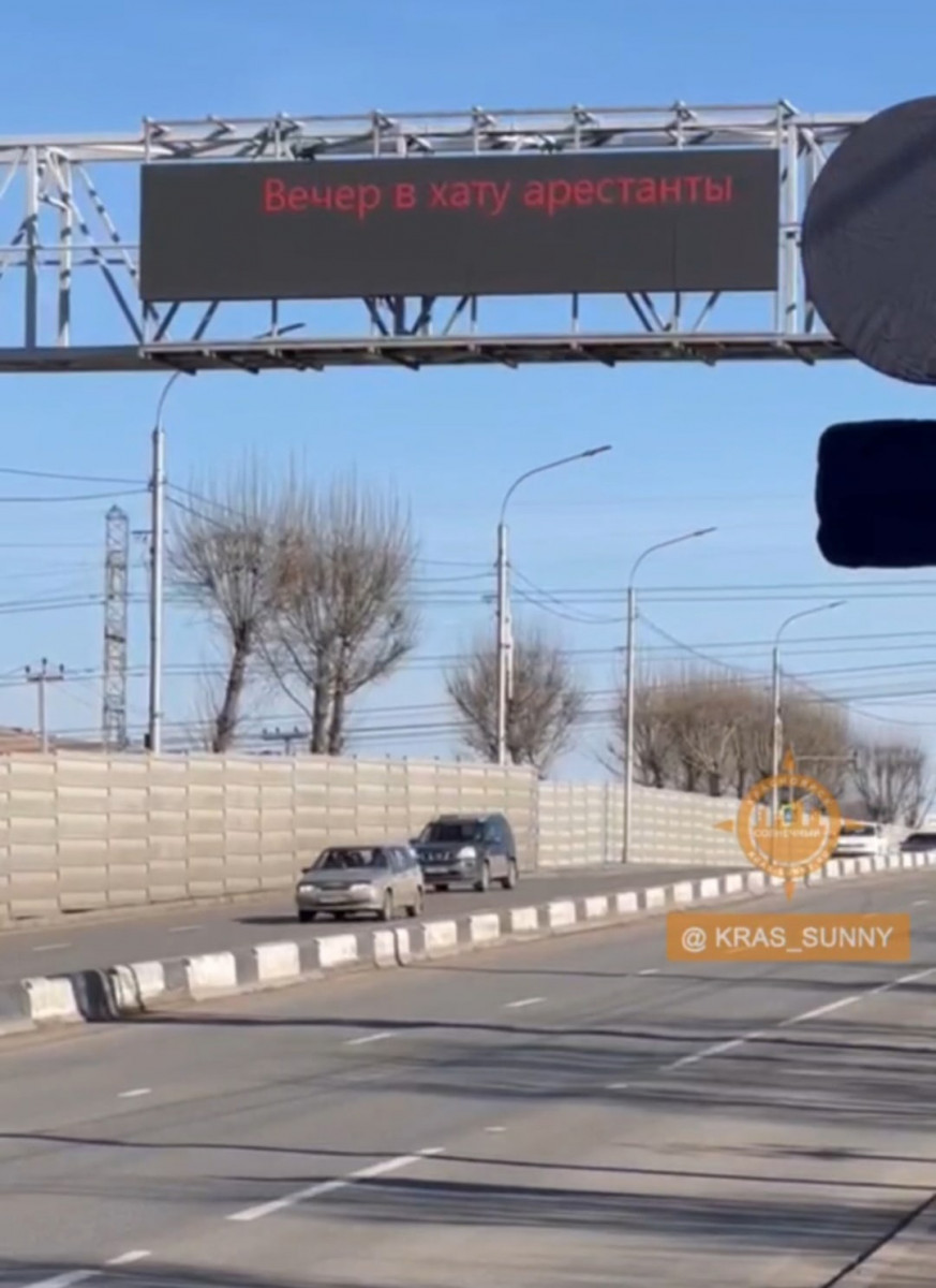 В Красноярске на информационном табло, которое находится на въезде в город на улице Калинина, появилась приветственная надпись: «Вечер в хату арестанты». Об этом рассказали в группе «Наш мкр. Солнечный. Красноярск» во ВКонтакте.
